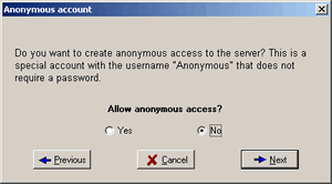 选择是否允许匿名访问,这里的示例选择的是“NO”,也就是用户需要用户名和密码才能访问FTP服务器,点击“Next”。