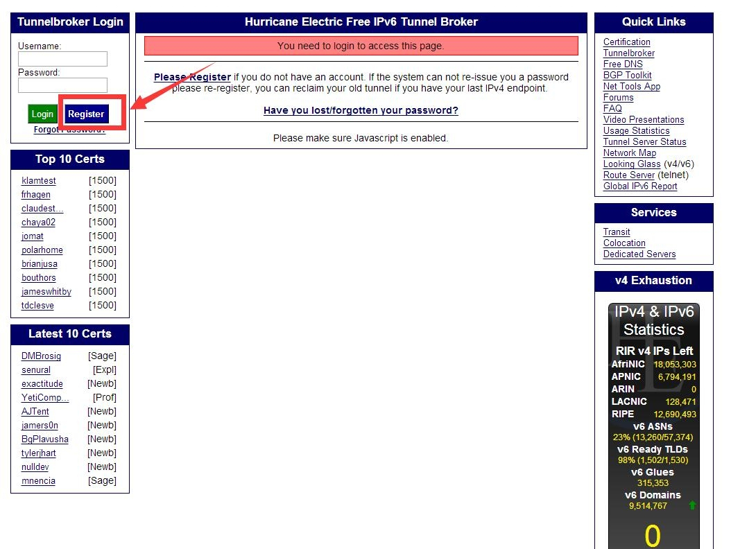(敲黑板,知识点来了)首先打开HE官方网站https://tunnelbroker.net/,点击左上角的register注册一个帐号记住你的帐号和密码,然后登录帐号(如下图)