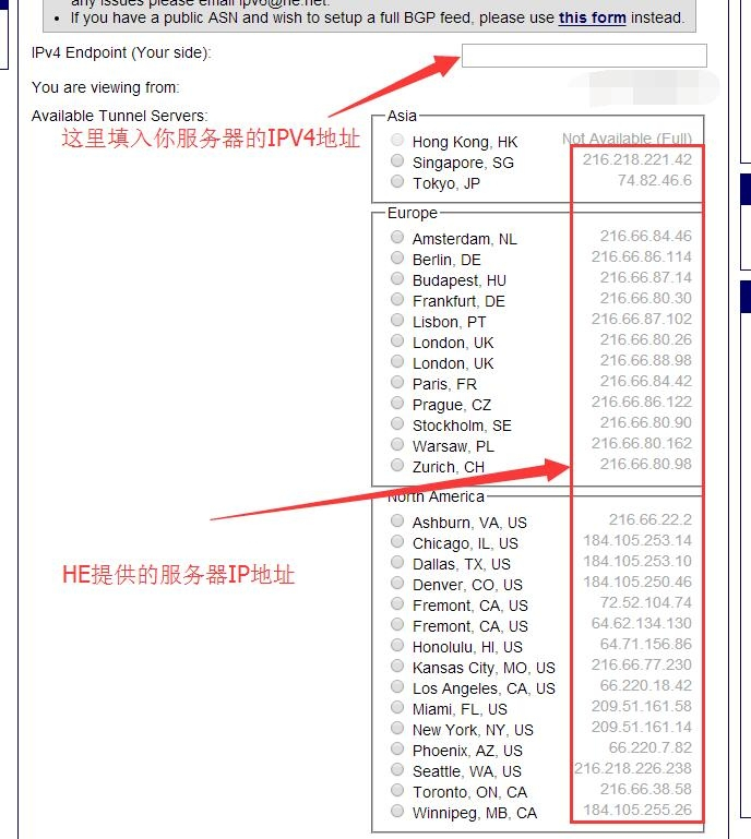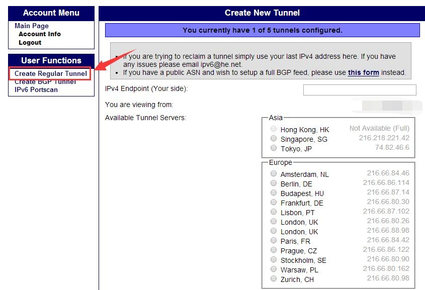 每个帐户可以申请5个IPv6 Tunnel,如果ISP支持BGP协议还可以申请BGP Tunnel,不过大部分人都不支持,所以还是老老实实地申请一般的Regular Tunnel吧。在左边点击User Functions下的Create Regular Tunnel (https://tunnelbroker.net/new_tunnel.php),输入你服务器的IPV4地址,建议大家在选择HE服务器之前先用自己的服务器ping一下HE提供的服务器地址,选择延迟最低的(香港的就不要考虑了一般都是满的状态,即使有货延迟也是高的一B,全程绕lax,一般延迟低的是Fremont, CA, US毕竟有海底光缆,这个也要视情况而定还是自己测试一下)(如下图)