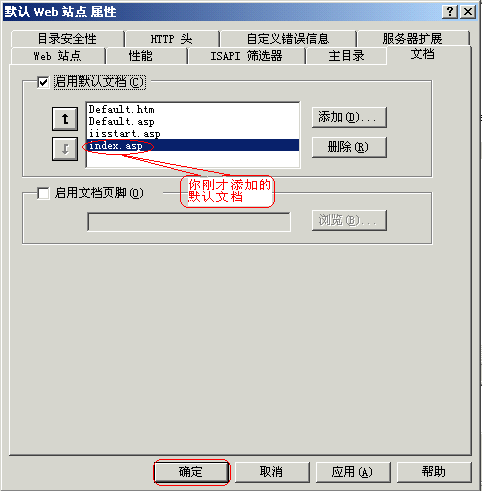 ⑶设置“文档”:单击“添加”按钮,弹出“添加默认文档”对话框,输入你的网站首页文件名,本文为index.asp。