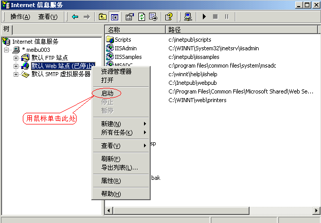 默认Web站点一般用于对向所有人开放的WWW站点,比如我们的“www.meibu.com”,任何用户都可以无限制地通过浏览器来查看它,请首先确认你的电脑已经安装了IIS。