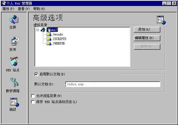 (6)点击左边的“高级”选项,默认文档(D):在文本框输入你的站点的首页文件名,本文为index.asp