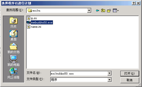 将路径指点到%systemroot%\meibu,如C:\Program Files\meibu\meibu 选中meibuddns50.exe,再点击“打开”