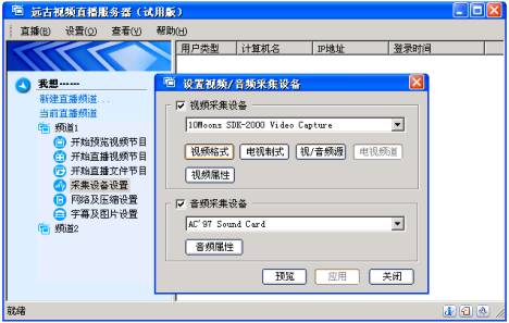 对于用电视卡直播电视节目(或现场摄像的画面),可以在服务器的“采集设备设置”中的“视/音频采集设备”选项中设置你所需要的设备。如(图六)