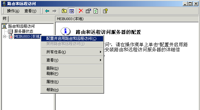 2.如果以前已经配置过这台服务器,现在需要重新开始,则在 “MEBU003”(服务器名)上单击右键,选“禁用路由和远程访问”,即可停止此服务,以便重新配置。